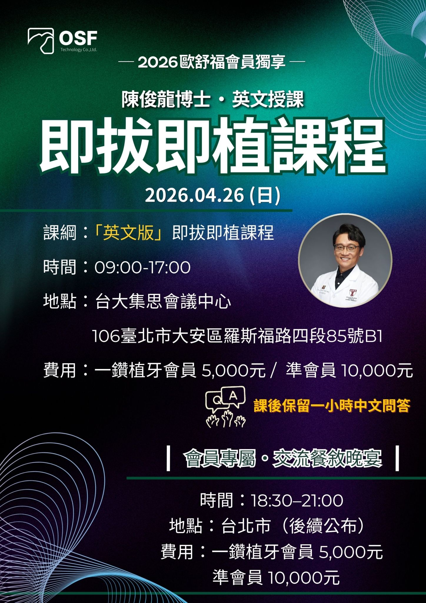 本次課程採全英文授課,更完整了解一鑽植牙的概念,