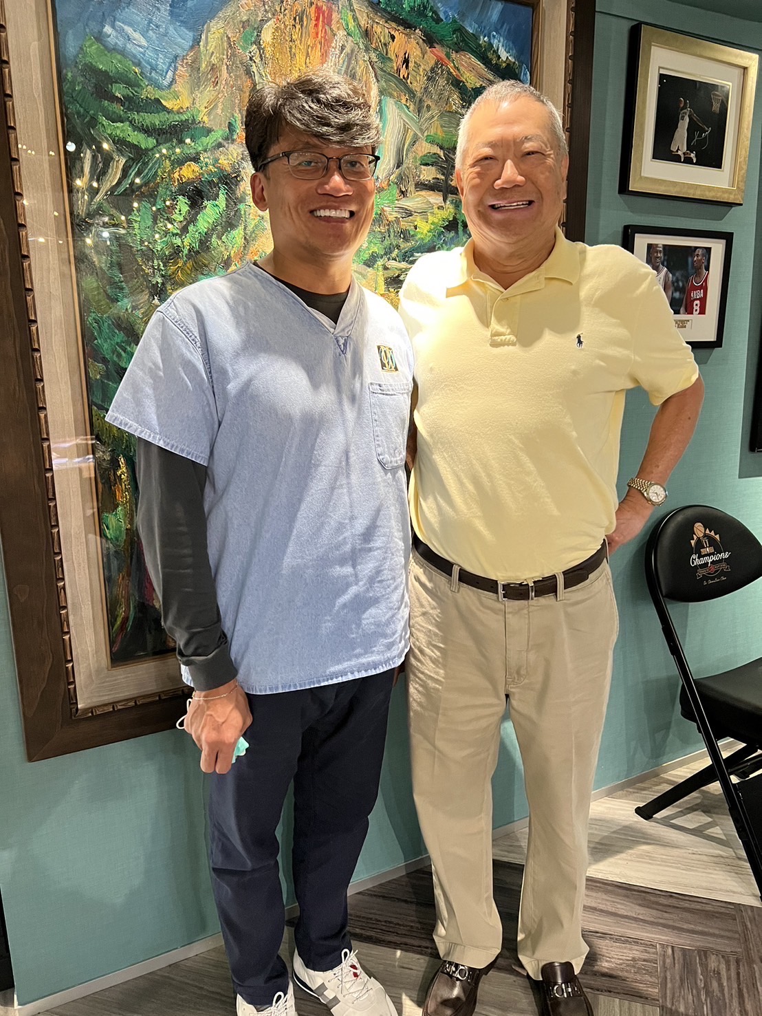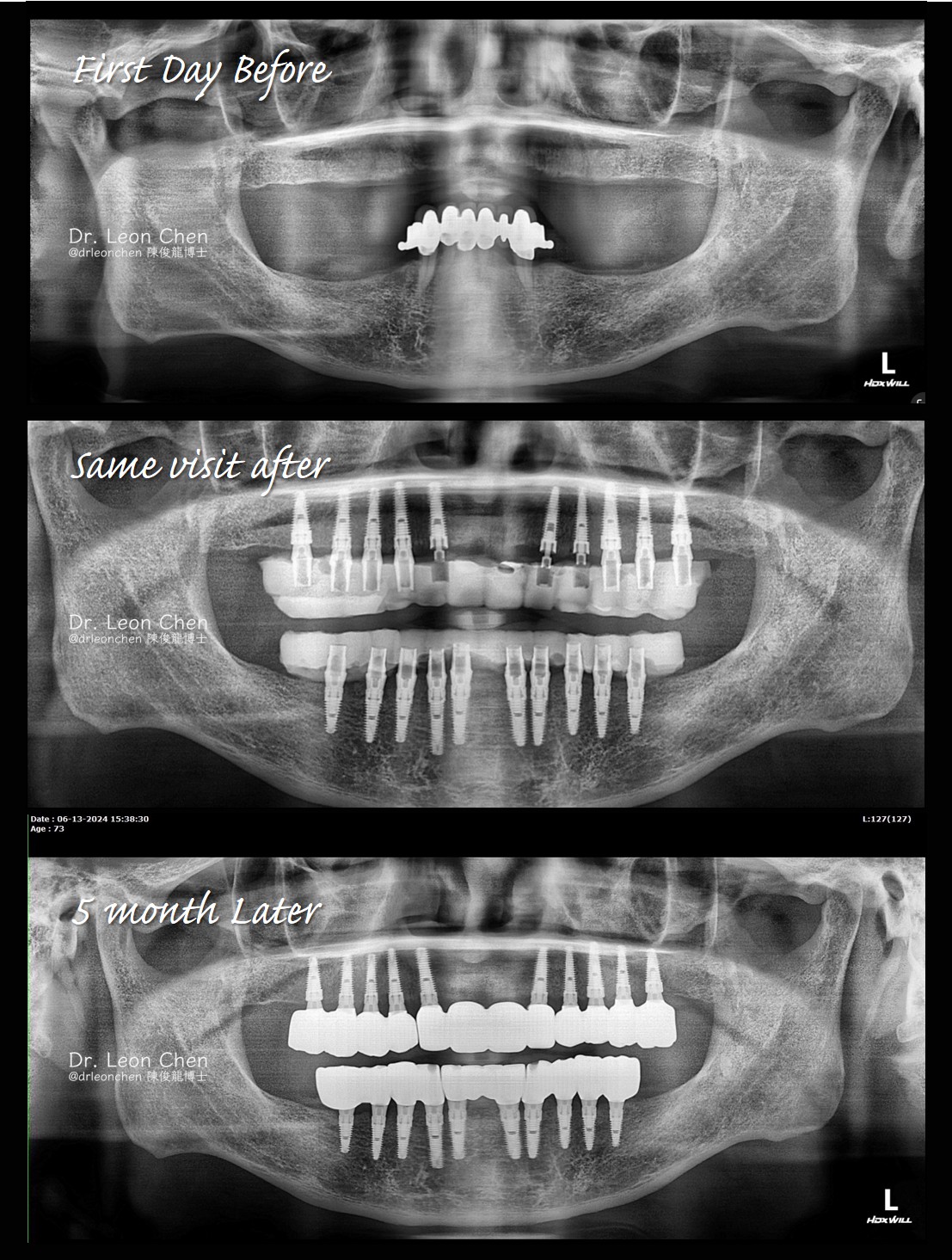 當天晚上就直接去應酬吃飯,他的朋友都不敢相信他剛植完牙過來。五個月後回診裝上永久牙。