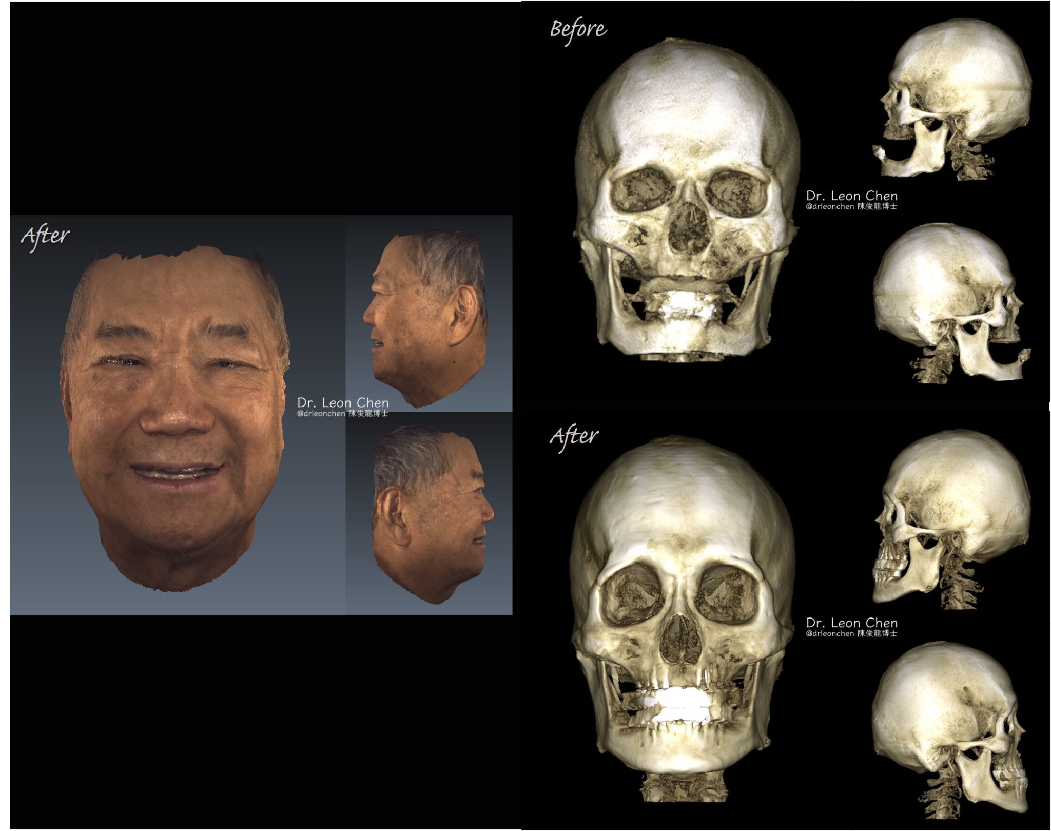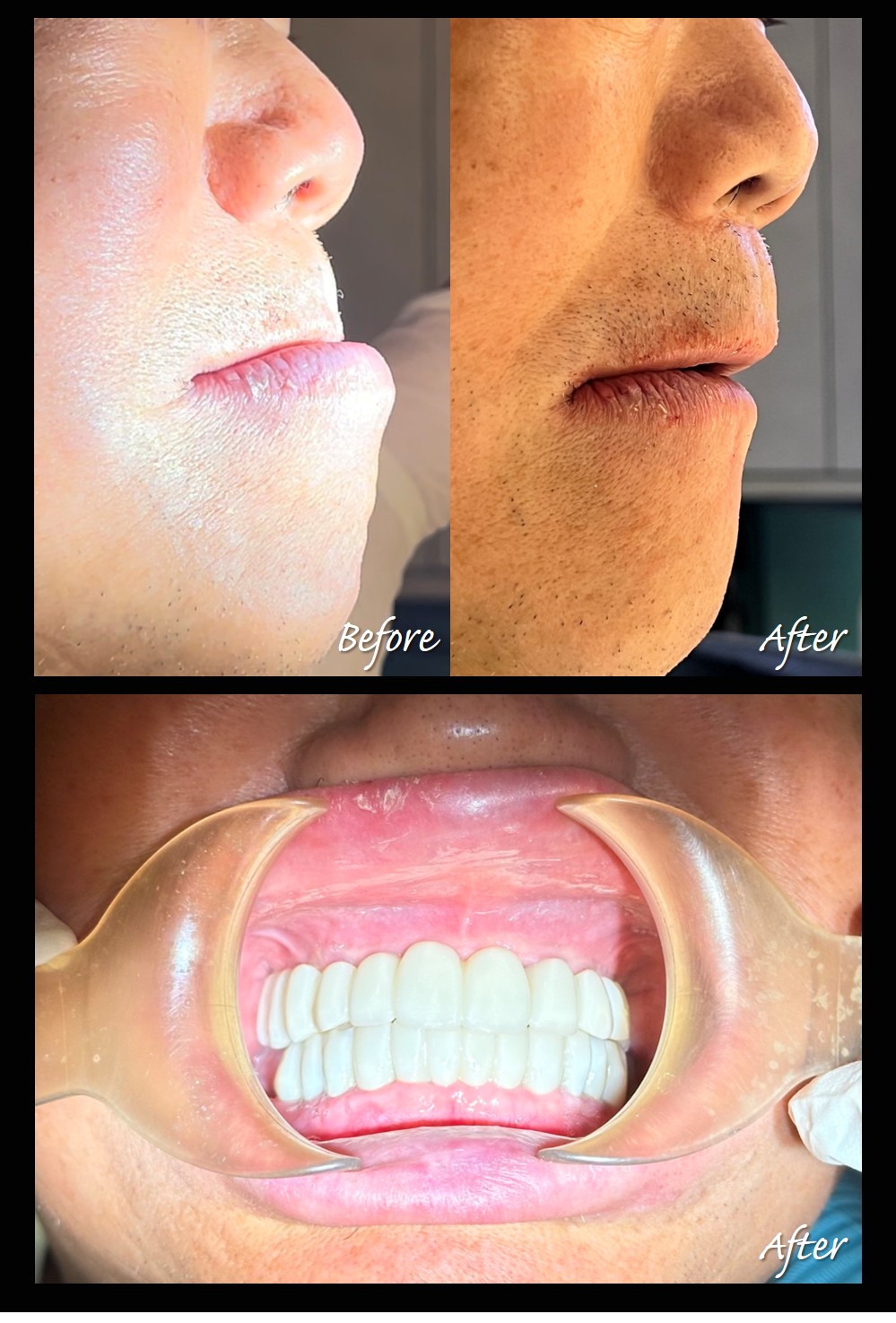 陳博士趕到診所會診後立即幫他治療,上顎植10顆、下顎植10顆,也馬上幫他裝上固定臨時牙,從戽斗直接變成接近正常咬合了。